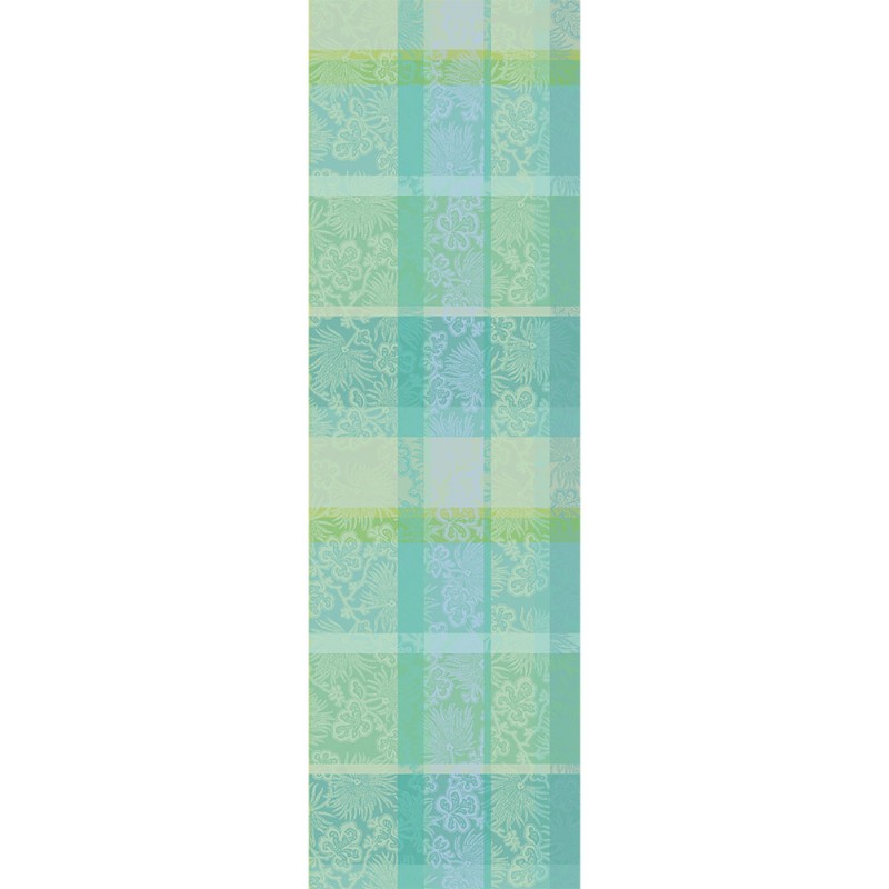 Chemin de table Mille Venusta Aqua. Un hommage à la nature avec cet élégant patchwork de tons verts, travaillé sur un damassé 100% coton haut de gamme 220g/m², parfait pour un déjeuner en tête à tête, ou en déco... Fabriqué en France. Signé Garnier-Thiébaut