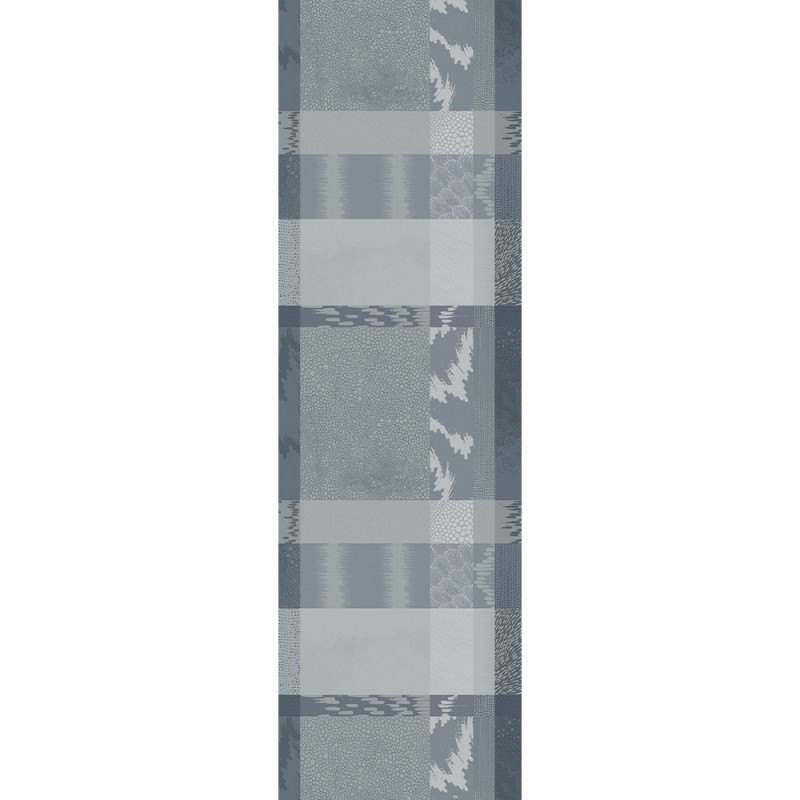 Chemin de table Mille Matières Orage. Motifs sophistiqués, camaïeu de tons bleus avec ce chemin de table ou vis à vis au damassé 100% coton 220g/m² de haute qualité. Il est parfait pour une ambiance urbaine, moderne... Fabriqué en France. Marque Garnier-Thiébaut