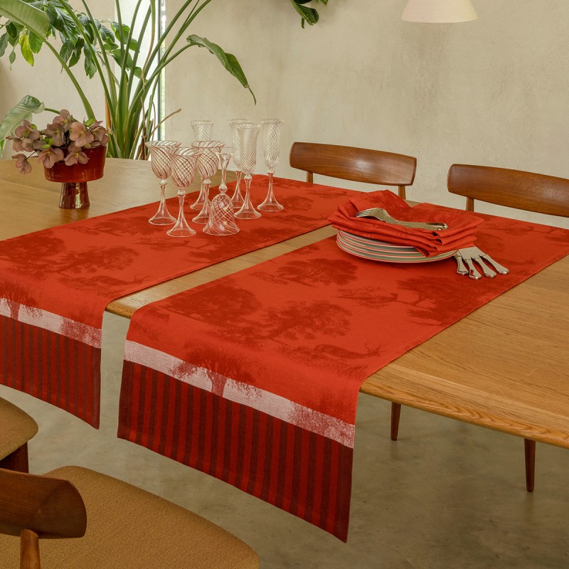 En rouge carmin, une collection grandiose qui se dessine en or comme une toile de Jouy où faisandeaux, marcassins, faons et levrauts se prélassent au sein d'une végétation luxuriante. Chemins de table réalisés en 100% pur lin, longues fibres dans gris argent. Finition coins onglets. Fabriqué en France. Le Jacquard Français
