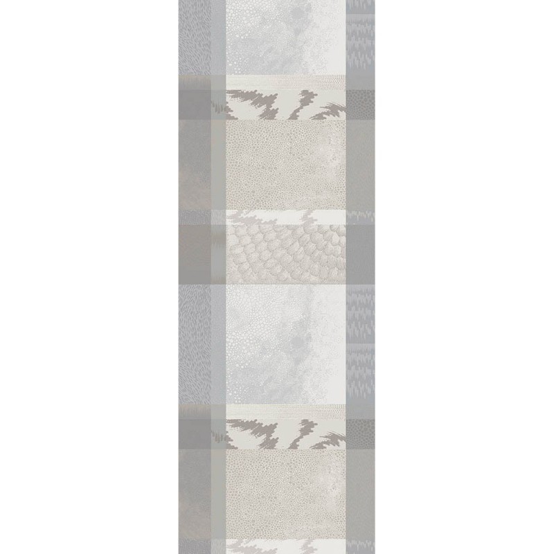 Chemin de table Mille Matières Vapeur. Motifs sophistiqués, camaïeu de tons doux avec ce chemin de table ou vis à vis au damassé 100% coton de haute qualité. Il est parfait pour une ambiance urbaine, campagne, jardin chalet, montagne... Fabriqué en France. Marque Garnier-Thiébaut
