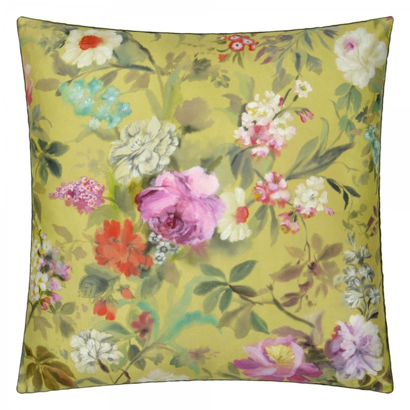 Proserpine Ochre, est un magnifique coussin muni d'une composition de pivoines et de roses peintes dans des tonalités de rose, corail et de vert sur un fond ocre. Finition passepoil kaki. Imprimé sur un satin de coton 80 fils/cm². Entièrement réversible, ses deux faces sont identiques. Il est assorti au bout de lit Proserpine Ochre. Signé Designers Guild
