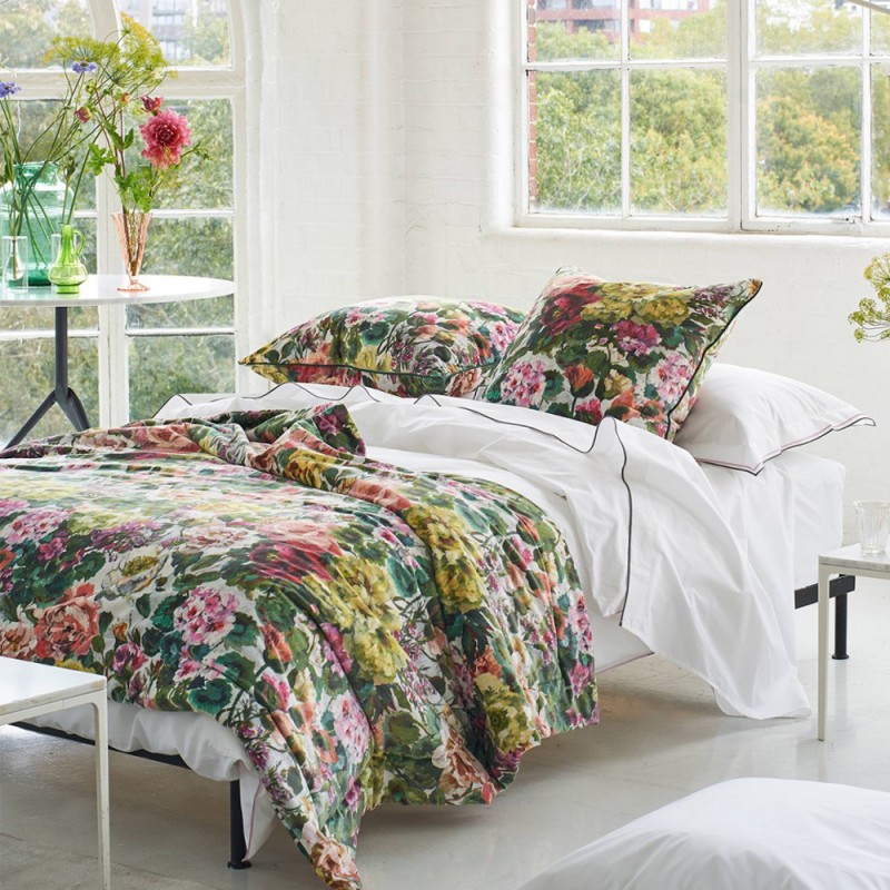 Le bout de lit édredon grandiflora Rose poudré, est un accessoire luxueux et élégant imprimé d'un superbe dessin d'aquarelle aux motifs de jolies fleurs printanières inspirées des jardins anglais. Entièrement réversible, ses deux faces sont identiques. 100% polyester. Signé Designers Guild