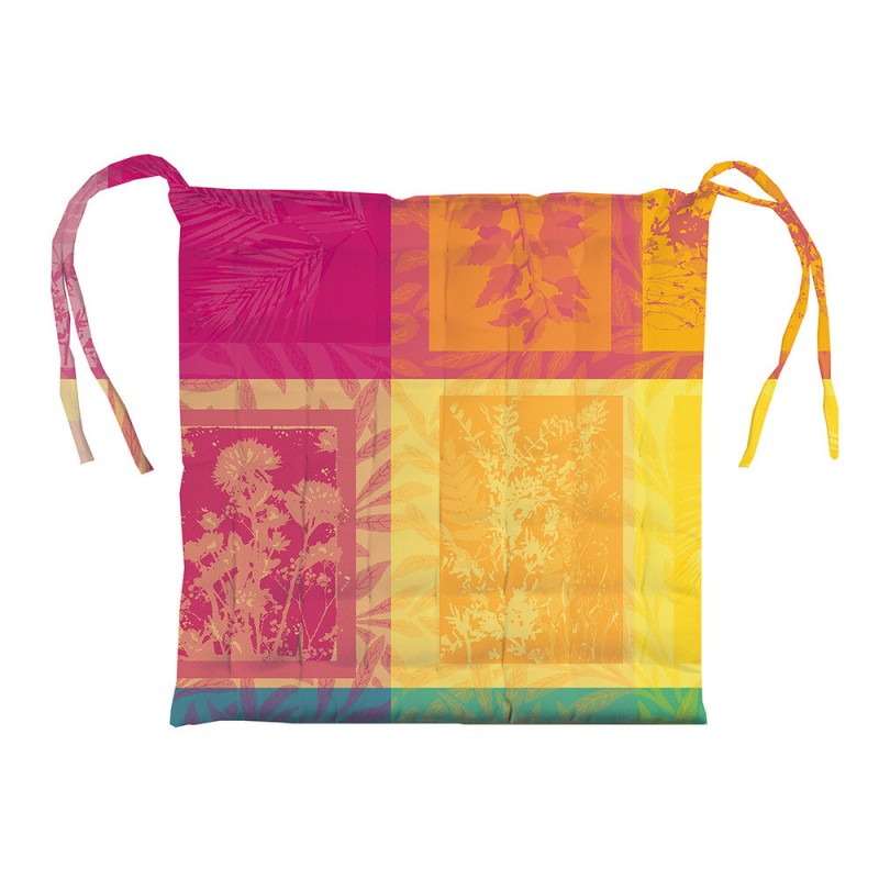 Mille Végétaux Arc-en-ciel, des galettes de chaises élégantes aux couleurs printanières parfaites au jardin, dans la cuisine. Des galettes de chaise carrées, matelassées qui associent élégance et aspect pratique. Elle sont réversibles, une face pur coton, une face en coton enduit, haut de gamme. Vendues par 2. Fabriqué en France. Marque Garnier-Thiébaut