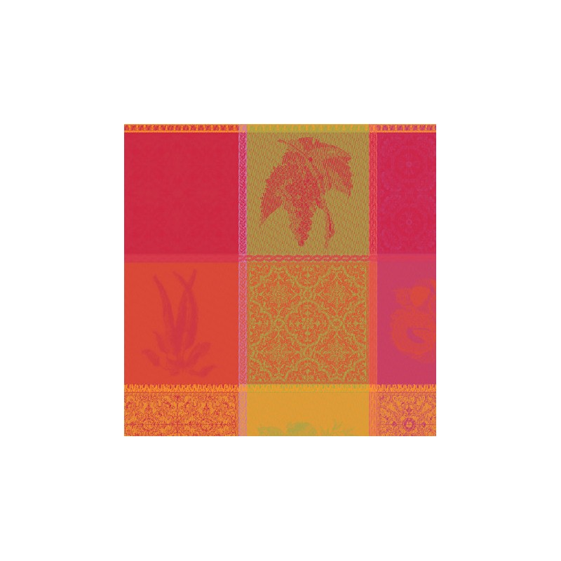 Serviettes de table Mille Tutti Frutti Sangria. D'une élégance excentrique et d'un beau madras d'oranger, de vert et de fuschia, ces serviettes de table sont assorties aux nappes Mille Tutti Frutti Sangria des collections Garnier-Thiébaut. Damassé 100% coton haut de gamme. Vendues par 4. Fabriqué en France.