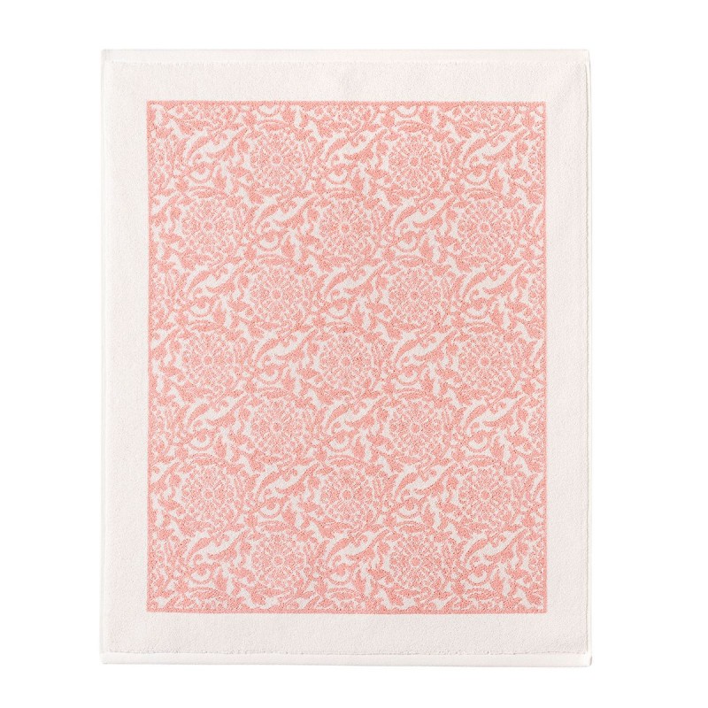 Délicatesse et élégance sont les atouts de cette collection de linge de bain où volutes et arabesques se composent dans un style baroque italien aux tons rose poudré. Tapis de bain en éponge jacquard 100% coton fils retors, 750g/m², particulièrement doux et confortable, aux qualités d'absorption et de rapidité de séchage exceptionnelles. Signé Le Jacquard Français