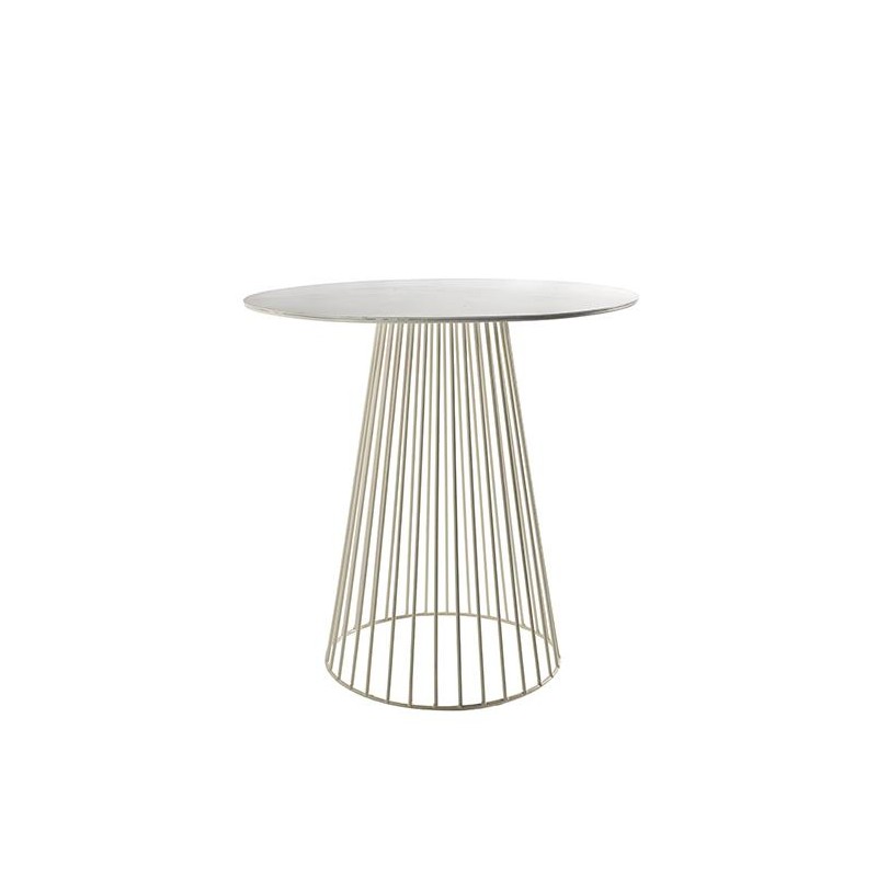 Descriptif : la table ronde Garbo est travaillée comme une sculpture. Elle est composée d'un plateau rond en métal, qui repose sur un piètement formé de tiges métalliques, laissant passer la lumière.