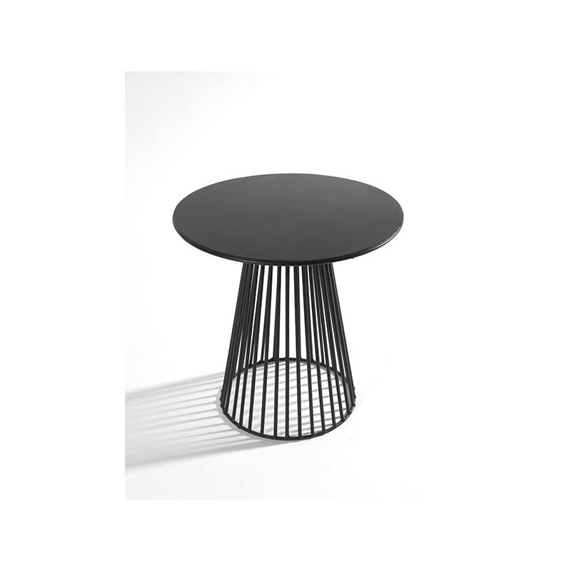 Descriptif : la table ronde Garbo est travaillée comme une sculpture. Elle est composée d'un plateau rond en métal, qui repose sur un piètement formé de tiges métalliques, laissant passer la lumière.