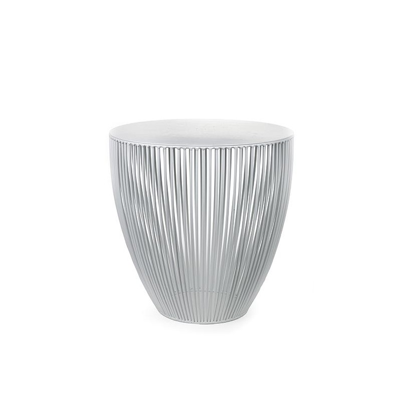 Descriptif : la table ronde Bingo, qui imite la forme d'un tambour africain, est travaillée comme une sculpture. Elle est composée d'un plateau rond en métal, qui repose sur un piètement formé de tiges métalliques verticales étroitement serrées, laissant passer la lumière.