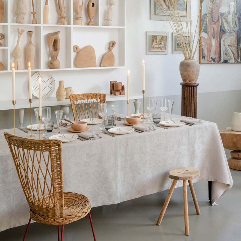Un modèle chic qui traverse le temps et s'impose comme un intemporel. Des motifs sophistiqués d'entrelacs, volutes et végétaux, parent ce superbe uni damassé coloris sable travaillé sur un pur lin. Nappe sur mesure de forme rectangulaire, carrée, ronde ou ovale. Laize en 245cm. Tissé en France. Le Jacquard Français