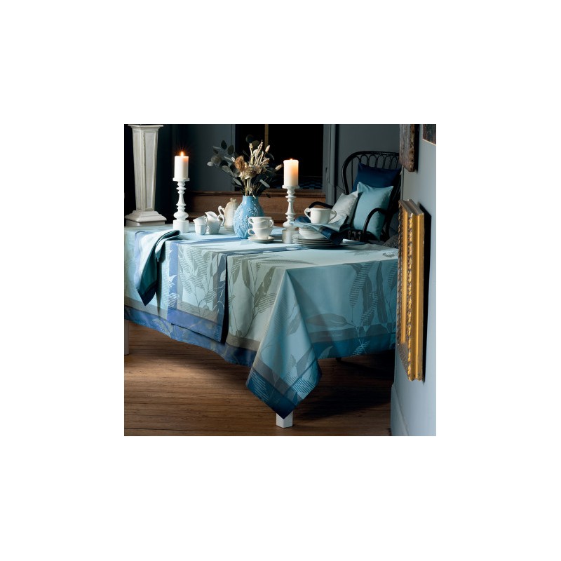 Un style élégant et moderne avec cette petite nappe aux nuances bleues, travaillée sur un 100% coton 220g/m², haut de gamme. Fabriqué en France. Marque Garnier-Thiébaut.