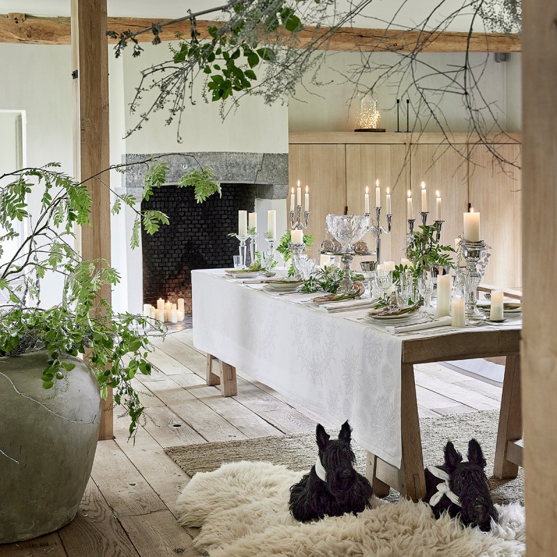 En édition limitée, dans un blanc scintillant c'est la nappe de Noël qui nous invite autour d'une table de fêtes de Noël et fin d'année. Travaillée sur un damassé 85% coton peigné longues fibres et 15% flis Lurex tissés dans le jacquard. Finition soignée avec coins capuchons. Tissé en France. Le Jacquard Français.