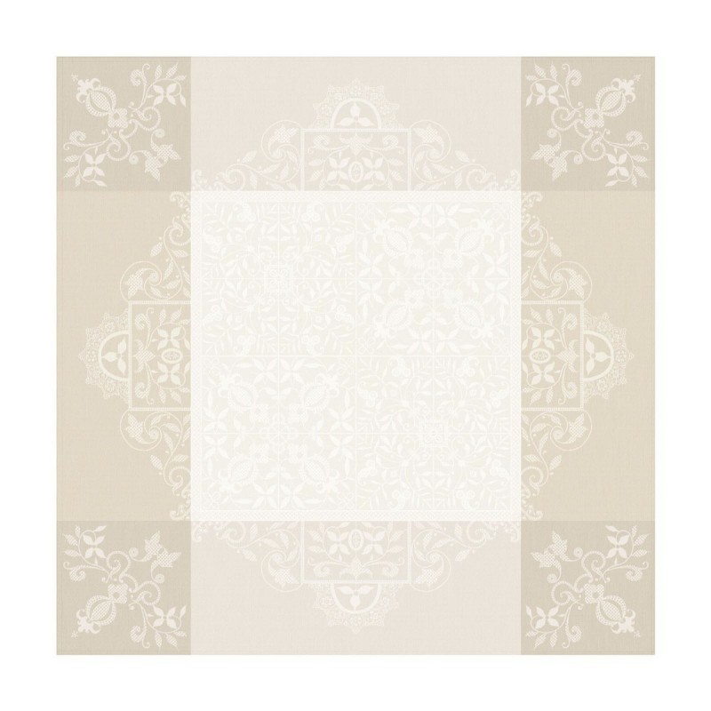Nappe Venezia Ivoire. C'est l'heure des mariages, des fêtes, des retrouvailles. On dresse les buffets et les tables se voilent de majestueuses nappes blanches tirées à quatre épingles... Plusieurs tailles, et grandes dimensions. Fabriqué en France. Le Jacquard Français