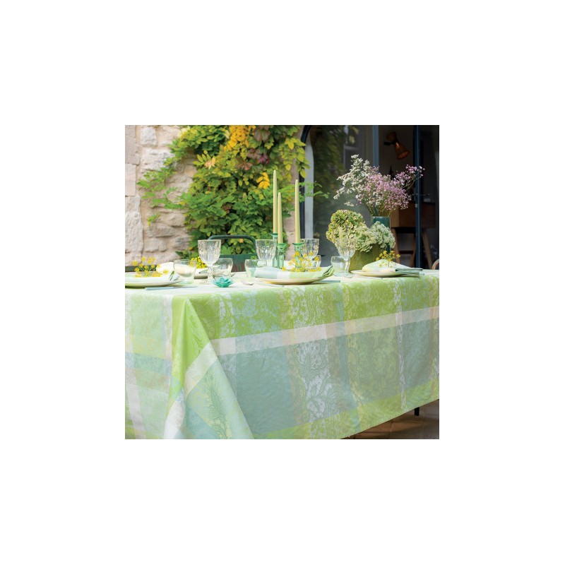 . Serviettes assorties serviettes de table Mille Dentelles Prairie ou serviettes unies Confettis coloris absinthe, blanc , blanc cassé(coloris identiques, même fils) s'associent parfaitement à cette nappe et permettent de créer des coordonnés variés... En vente dans la rubrique serviettes de table.