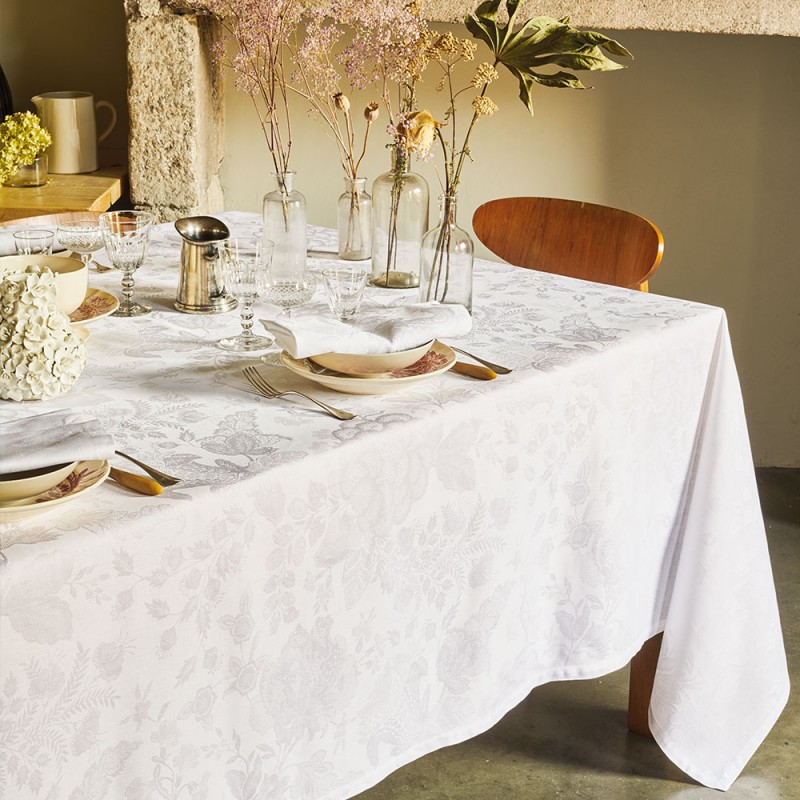 La pureté du blanc avec ce modèle raffiné placé sous le signe de la nature. Damassé en métis 52%coton et 48% lin haut de gamme. Facile à vivre avec son traitement anti-tache durable Green Sweet. Laize 180cm, tissé en France, signé Garnier-Thiébaut. Confection de votre nappe sur mesure ronde, carrée, rectangulaire ou ovale.