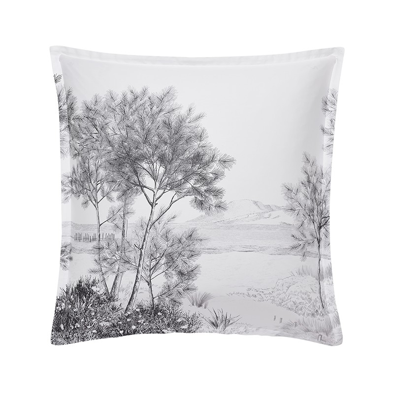 Inspirée d’un papier-peint de la marque Isidore Leroy, la parure de lit imprimée Dune nous offre paysage panoramique empreint de sérénité, un décor reposant décliné dans un camaïeu de gris apaisé par uni blanc au dos. Ce modèle luxueux est travaillé sur un satin de coton, 100% coton Bio longues fibres 120 fils/cm². Linge de maison haut de gamme Alexandre Turpault. En plusieurs dimensions.