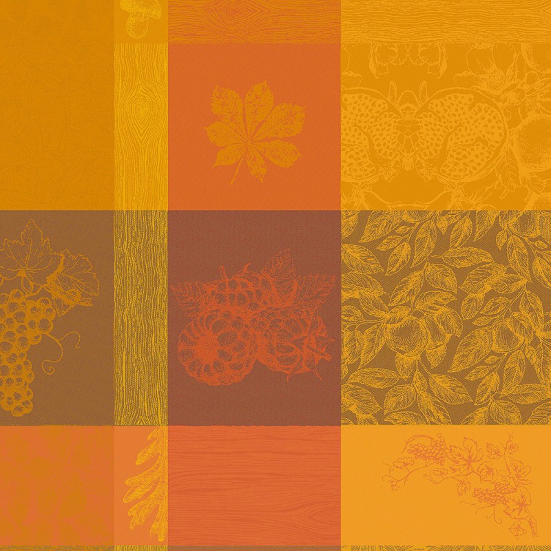 Petit carré déco Mille Bois d'Automne Potiron. Cette petite nappe fantaisie sous le signe de la nature, aux couleurs chatoyantes, est parfaite pour une déco champêtre, jardin... Elle est travaillée sur un damassé 100% coton de haute qualité 220g/m². Fabriqué en France. Marque Garnier-Thiébaut