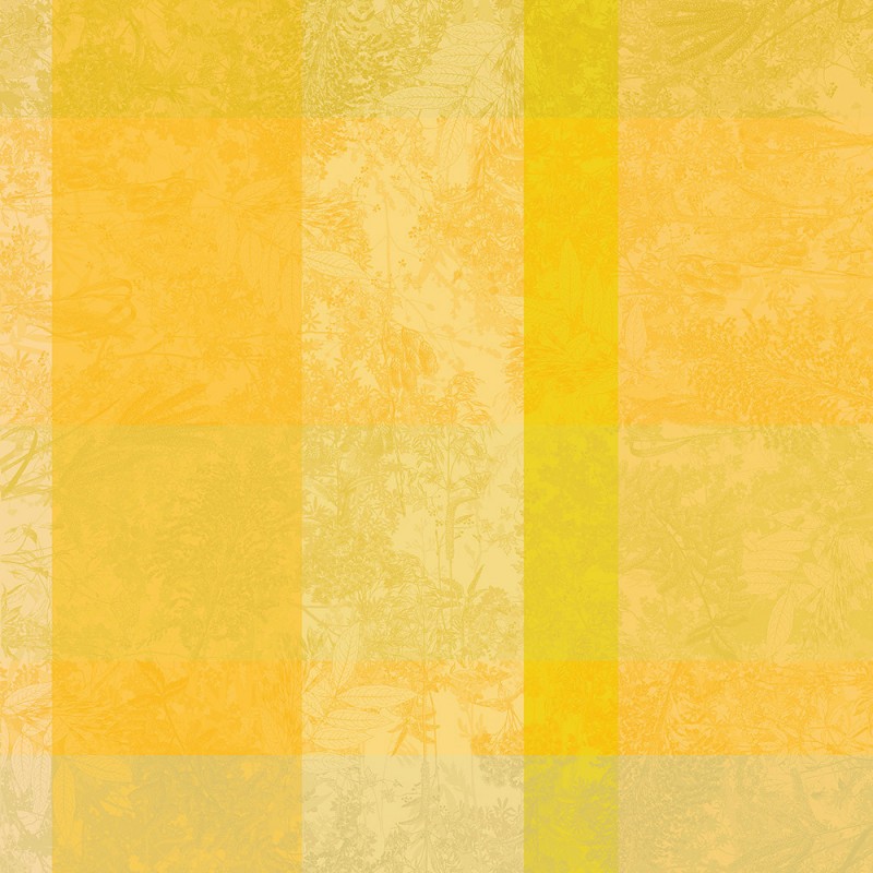 Petit Carré déco Mille Esprit jardin Solaire. Petit carré déco, petite nappe. Fantaisie, légèreté et ambiance champêtre avec cette petite nappe fantaisie travaillée sur un damassé 100% coton 220g/m², de haute qualité. Fabriqué en France. Marque Garnier-Thiébaut