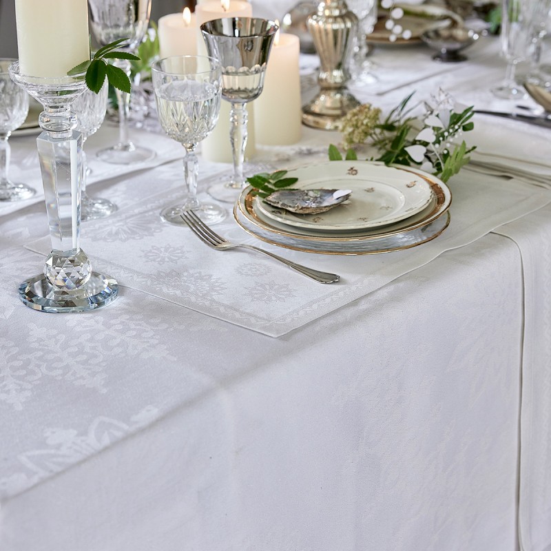 En édition limitée, dans un blanc scintillant c'est le petit carré déco de Noël qui nous invite autour d'une table de fêtes de Noël et fin d'année. Travaillé sur un damassé 85% coton peigné longues fibres et 15% fils Lurex tissés dans le jacquard. Finition soignée coins capuchons. Tissé en France. Le Jacquard Français.