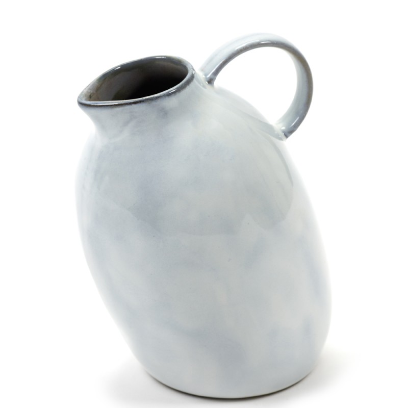Carafe ou pichet Terres de Rêves White. Ce pichet comme autrefois, de matière traditionnelle, en céramique, de forme simple et originale, tout en rondeur, imaginé par la créatrice bruxelloise Anita Le Grelle, trouvera toujours sa place à table. Il peut aussi être exposé, et devenir un élément de déco. Collection Terres de Rêves, signée Anita Le Grelle, pour Serax.