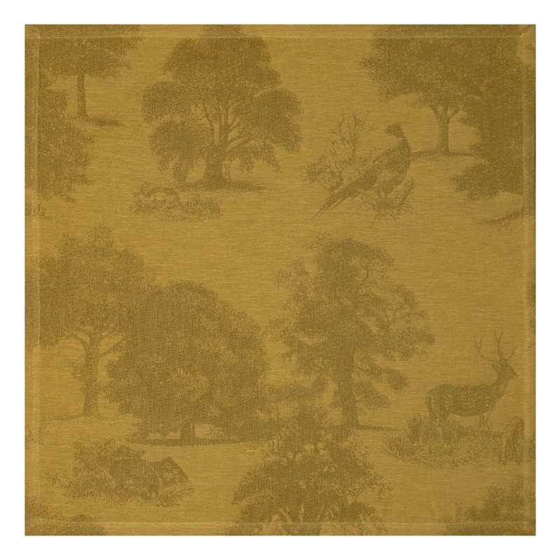 Une collection grandiose qui se dessine comme une toile de Jouy où faisandeaux, marcassins, faons et levrauts se prélassent au sein d'une végétation luxuriante. Ces splendides serviettes de table sont assorties au linge de table Souveraine Or, 100% pur lin longues fibres. Fabriqué en France. Vendu par 4. Le Jacquard Français