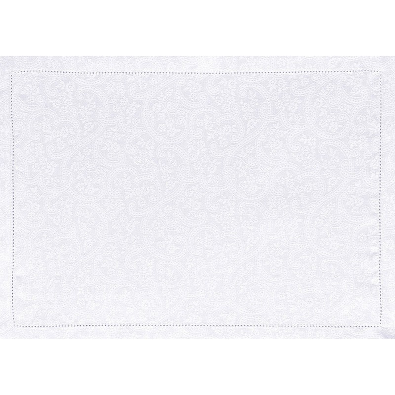 Portofino Fiori Bianco, c'est la pureté du blanc, le charme d'un dîner à l'italienne, le luxe et le raffinement d'un uni 100% lin. Un modèle au motif fleuri délicat. Sets de table déco, de réception, cérémonie. Traités antitache. Tissés en France. vendus par 4. Le Jacquard Français.