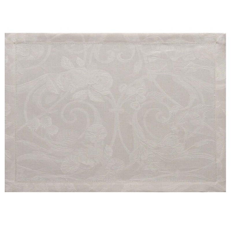 Sets de table Tivoli Sabbia. Des motifs voluptueux d'entrelacs, volutes et végétaux, parent ce superbe uni damassé en pur lin, chic et intemporel, travaillé dans un coloris sable. Sets de table déco, de réception, cérémonie. Vendus par 4. Tissés en France. Le Jacquard Français.