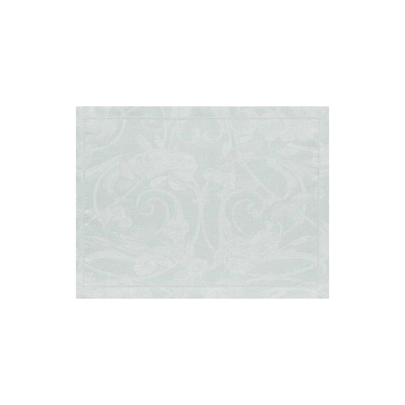 Sets de table Tivoli Brume. Des tons pastels, des motifs voluptueux d'entrelacs, volutes et végétaux, parent ce superbe uni damassé en pur lin chic et intemporel. Finitions raffinées. Sets de table vendus par 4. Tissés en France. Le Jacquard Français.