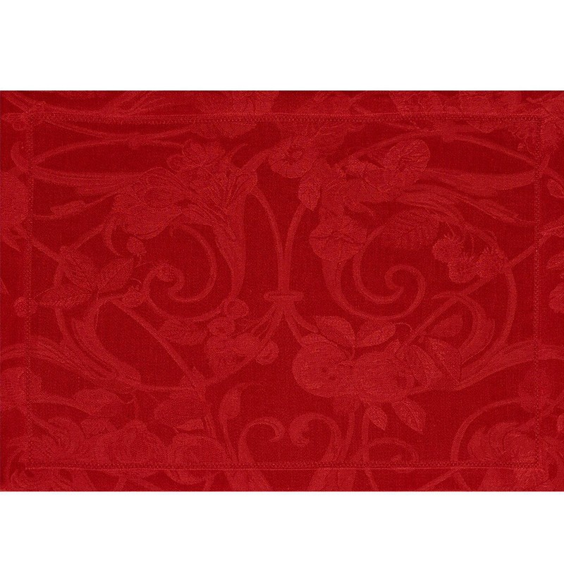 Sets de table Tivoli Velours. Des motifs voluptueux d'entrelacs, volutes et végétaux, parent ce superbe damassé travaillé dans un coloris rouge velours en pur lin, chic et intemporel. Sets de table déco, de réception, cérémonie, vendus par 4. Tissés en France. Le Jacquard Français.