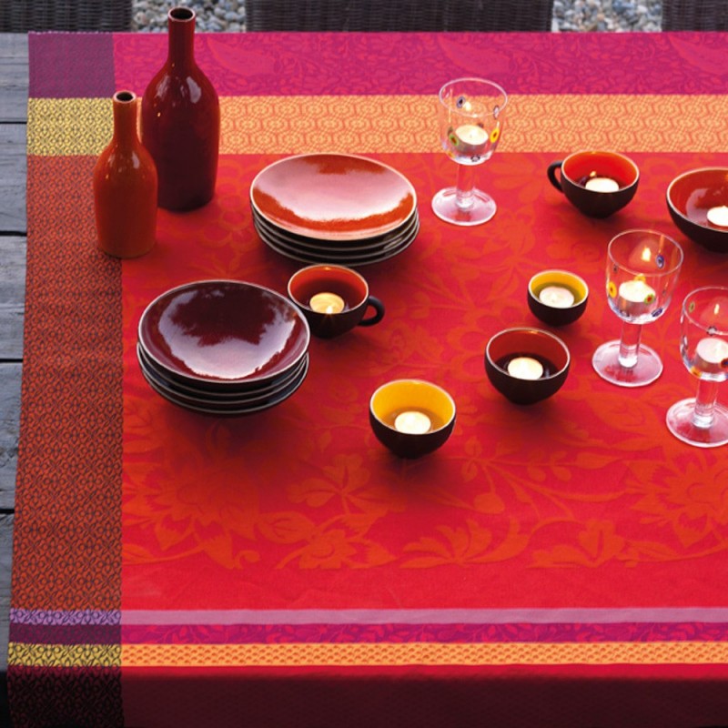 Avec le tissu enduit Provence Gariguette, la table s'invite au balcon, en terrasse. Damassé de coton enduit haut de gamme traité anti-taches, souple au joli tomber d'une nappe traditionnelle. Tissu enduit laize 180cm. Fabriqué en France. Le Jacquard Français. Possibilité de confection de votre nappe enduite sur mesure.