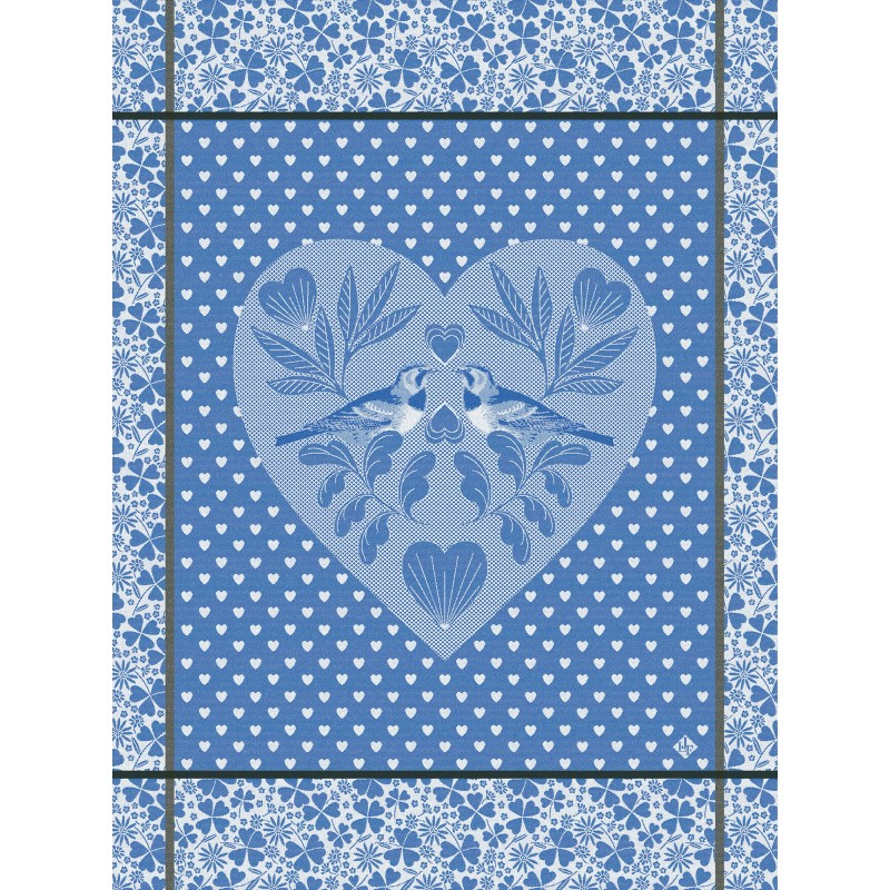Sur un air folk et champêtre, ce torchon célèbre l'amour et la chance. Les motifs semi de coeurs, trèfles et alouettes se composent comme un tableau. Torchons de cuisine de qualité en pur coton. Tissés en France. Le Jacquard Français. Vendus par 4