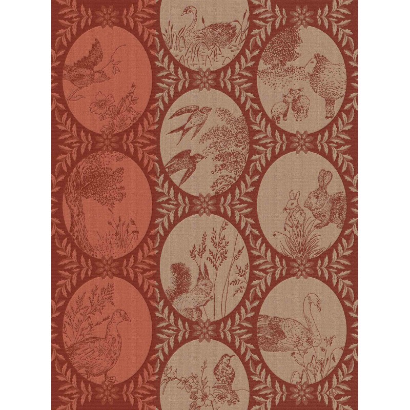 Une collection de linge de cuisine au charme purement français. Une toile de Jouy revisitée sur laquelle cygnes, lapins, et hirondelles apparaissent dans des médaillons romantiques en rouge pavot. Torchons de cuisine de qualité en pur coton. Tissés en France. Le Jacquard Français.