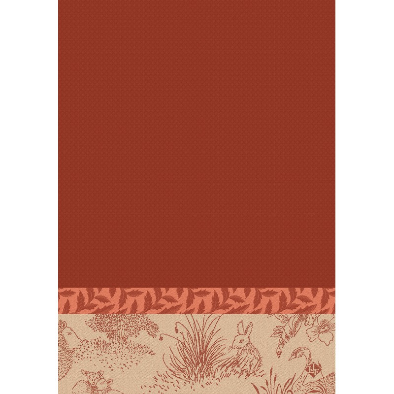 Voici des essuie-mains raffinés au tissage délicat sur lesquels cygnes, lapins, et hirondelles apparaissent dans un jardin bucolique en rouge pavot. Tissage nid d'abeilles pur coton. Fabriqué en France. Signé Le Jacquard Français.